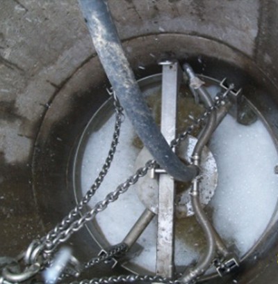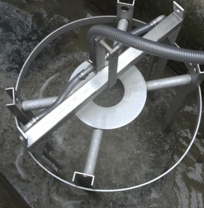 曝气和杂质的再循环是由在远处的操作室或室外控制柜的鼓风机产生。压缩空气由鼓风机通过一个压力软管或者不锈钢管进入沉砂池。一个快速的对接耦合使得空气压力和砂砾收集篮连接。在耦合点坚硬的不锈钢管将压缩空气传送到篮子的底部,压缩空气吹到篮子底下通过一种特殊的曝气系统形成一个空气地毯。由于有再循环作用有机物质的沉积可以避免,因此,这些有机物质随着水流流走。曝气可以连续进行或者根据需要由定时器控制(时间继电器,PLC等)。