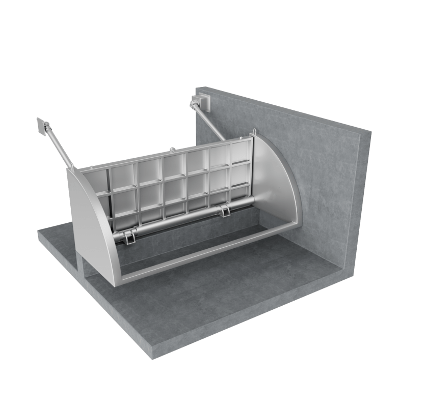 框架和堰门板均由耐腐蚀材料制成。它们配备的支撑铰链由免维护的聚酰胺制成。底部和侧面的特殊唇形密封可确保堰门关闭状态时密封(符合DIN 19569-4标准的密封性要求)。